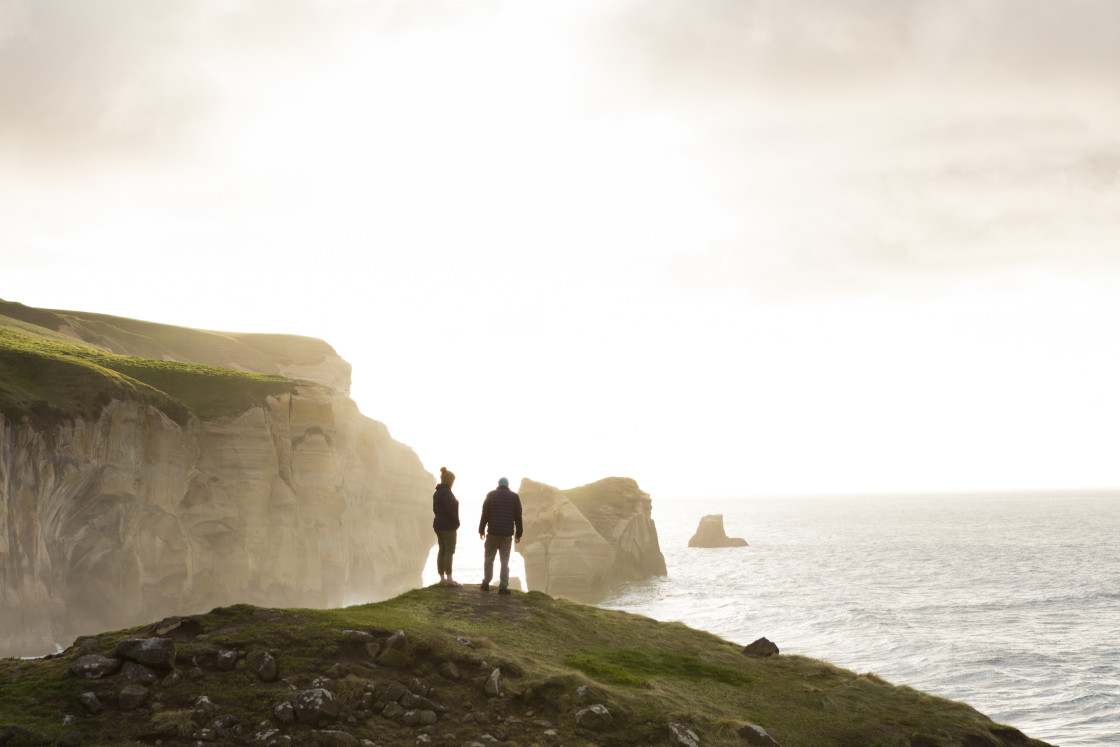 Stephanie Sykes and Dean Turner watch the sun rise at the iconic Tunnel Beach, Dunedin, New Zealand.