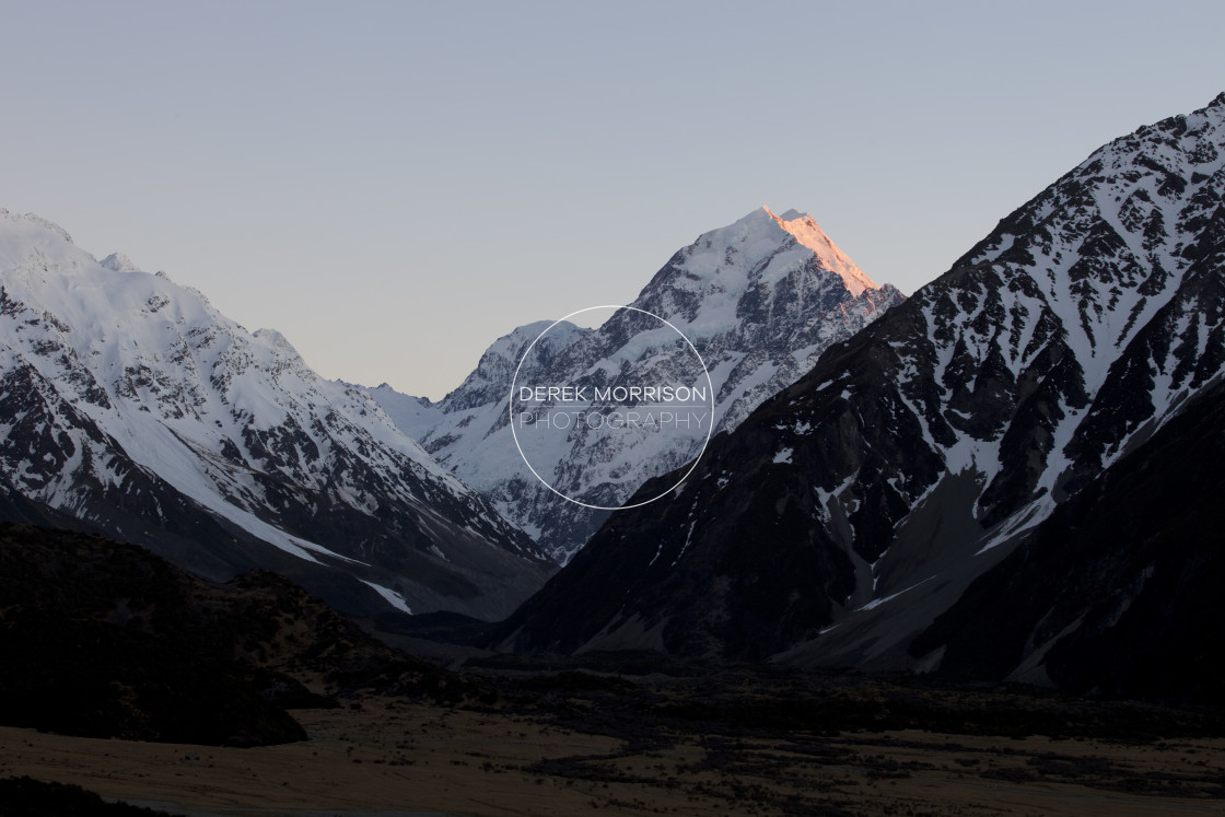 Vew of Mount Cook (3754m, centre) at sunrise from the Mount Cook Alpine Village, Canterbury, New Zealand.