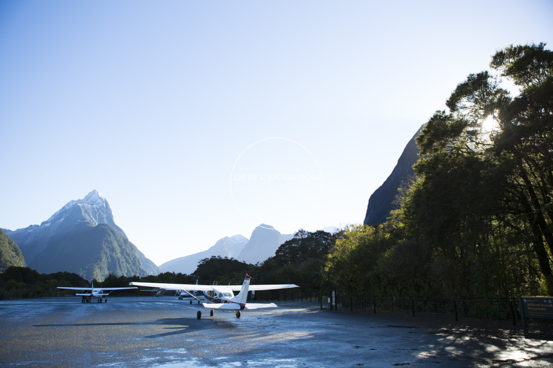 An aeroplane sits on the deck at the airstrip in Milford Sound on a perfect day in Fiordland, New Zealand.
